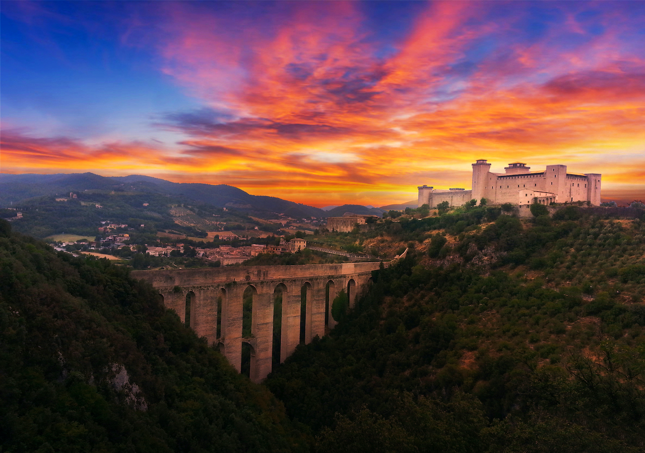 Il Ponte delle Torri e la Rocca Albornoziana al tramonto: simboli di Spoleto che dominano la valle in uno scenario spettacolare.